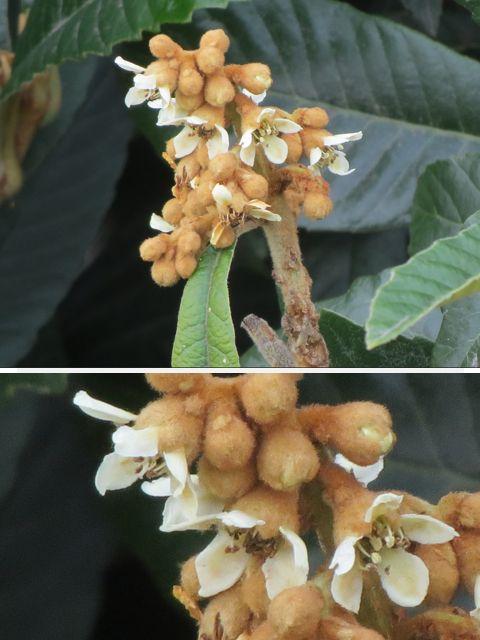 冬至の日(12/21)の散歩で、枇杷の花が咲いているのに気が付きました。花が少ない季節ながら、誇ることなくひっそり(?)と咲くから見過ごしてしまう。