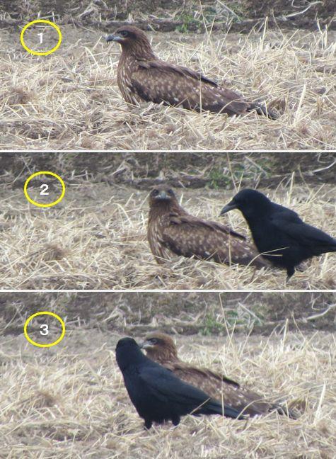 ➁ そこにカラスが音もなく忍び寄る。トビがびっくりして振り向く。これも珍しい光景だ。