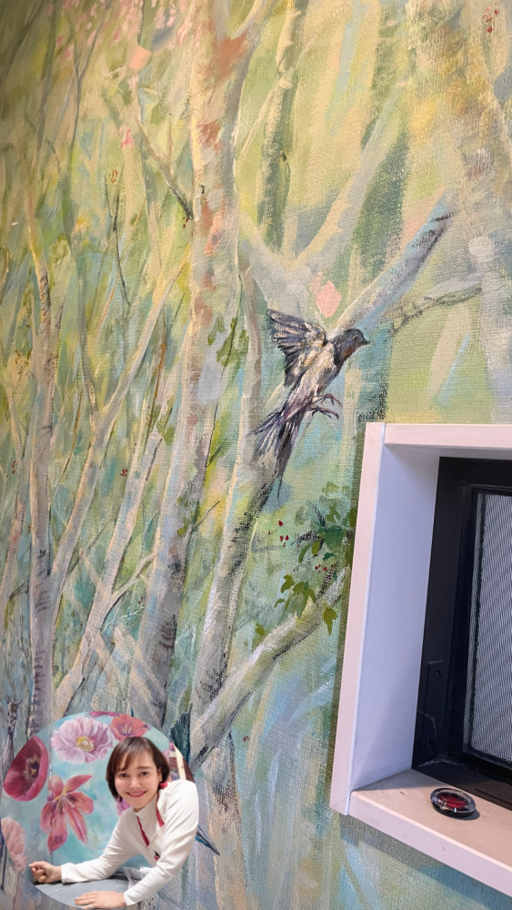 鳥や木々の表現も美しく、ただ飾るための絵ではなく、その場に物語を生み出し、空間の価値そのものを高める表現だと感じました。